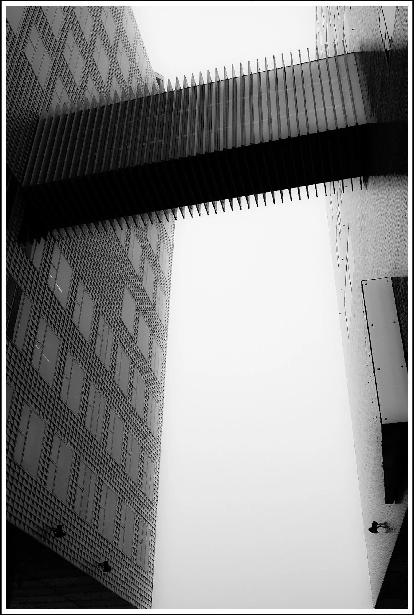 Black and white photograph of modern architectural buildings connected by an elevated walkway, with a cloudy sky in the background.