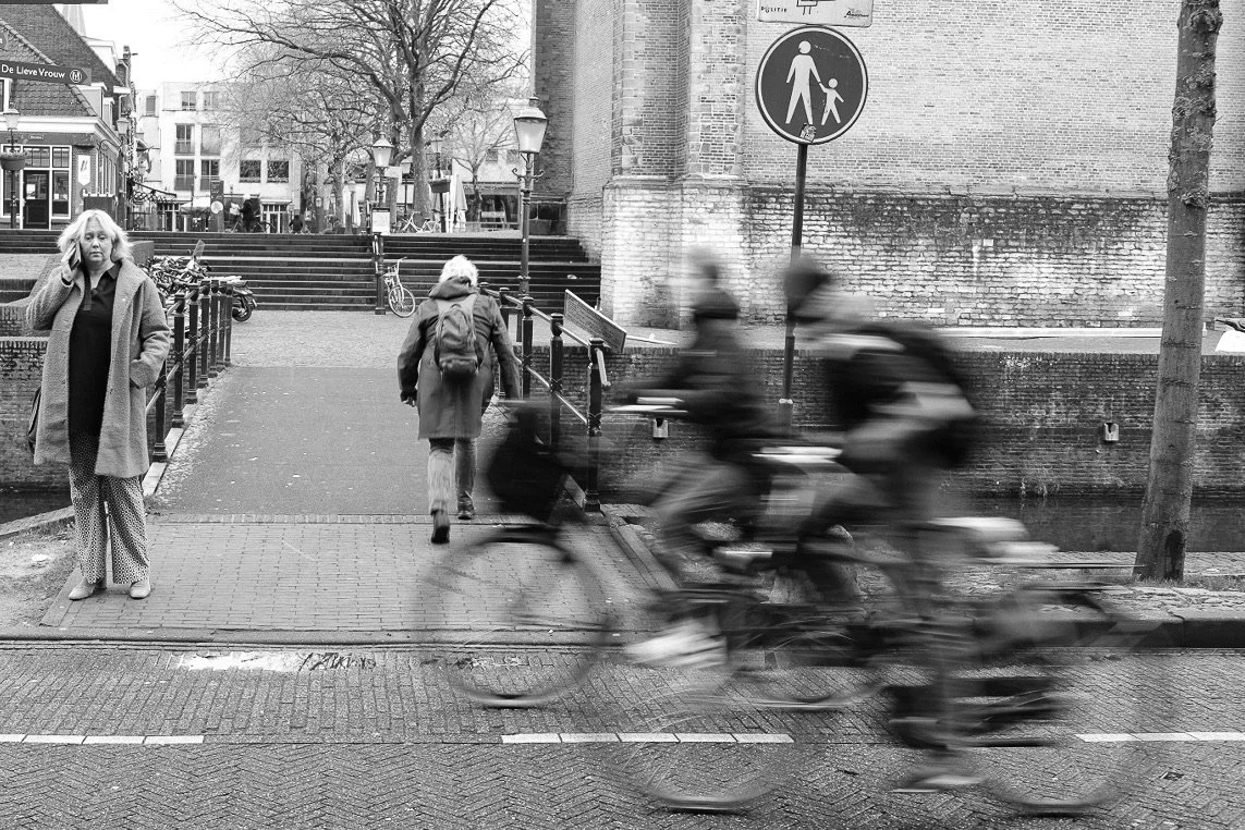 Black and white photo of a city sidewalk with pedestrians walking, a woman on the phone, two people blurred riding bikes, and a street sign indicating pedestrian path, with buildings and trees in the background.