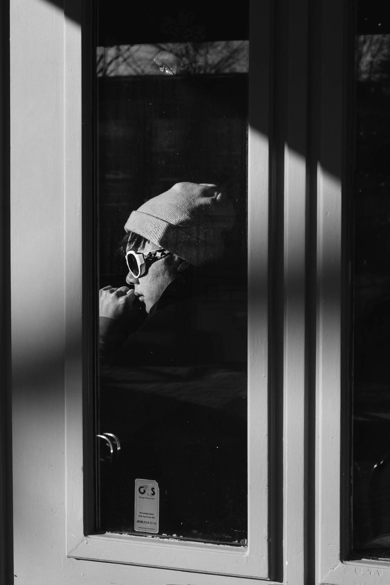 A person wearing a beanie, sunglasses, and a jacket, seen through a glass door or window in black and white. The person is looking to the side and appears to be deep in thought.