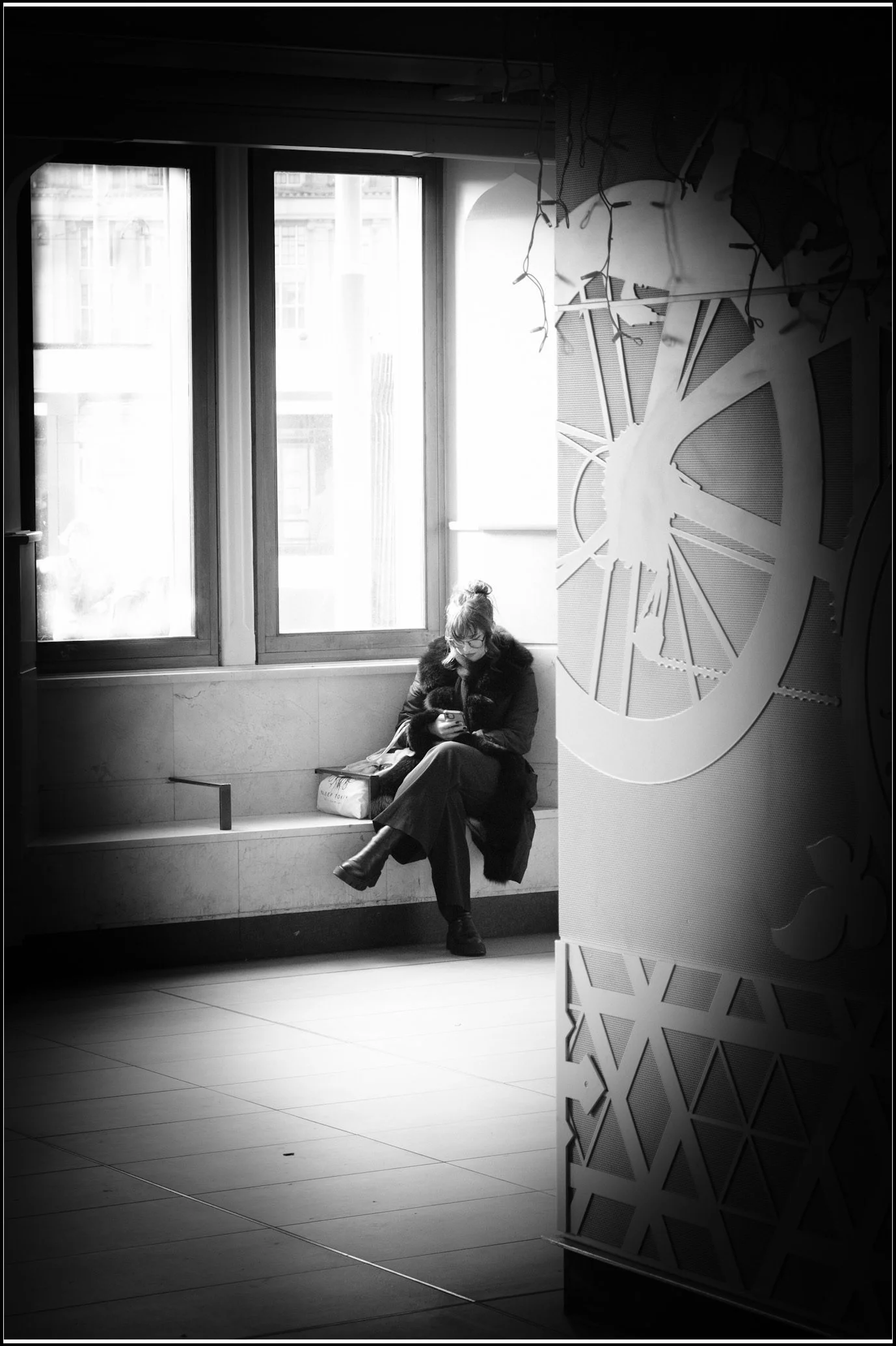 A woman sitting on a bench near a window, looking at her phone, with a large bicycle mural on the wall beside her, in a black-and-white photo.