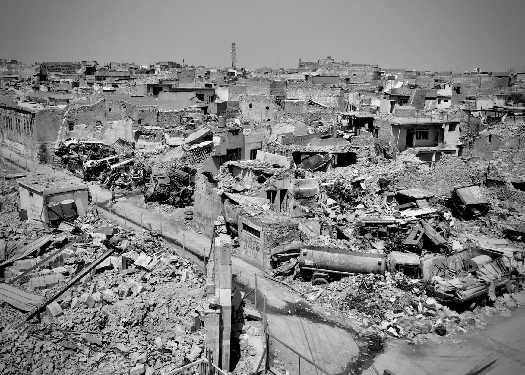 Black and white photo of a heavily destroyed urban area with rubble, destroyed vehicles, and damaged buildings.