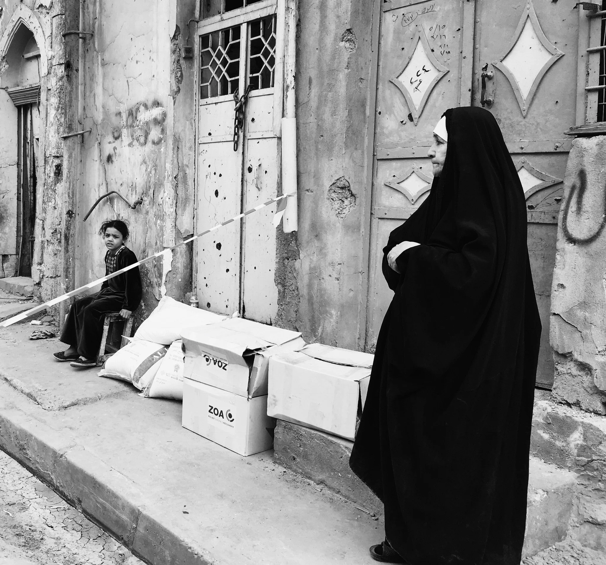 Black and white photo of a woman in traditional attire standing on a sidewalk, facing a young girl sitting on a small stool, with boxes and bags on the ground nearby. The scene appears to be in an older, worn-down urban area.