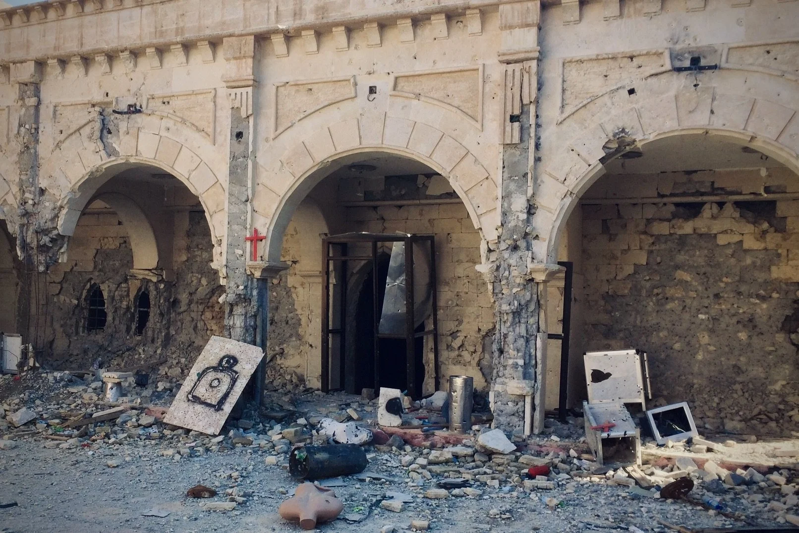 Damaged stone building with arches, debris, and broken furniture scattered on the ground.