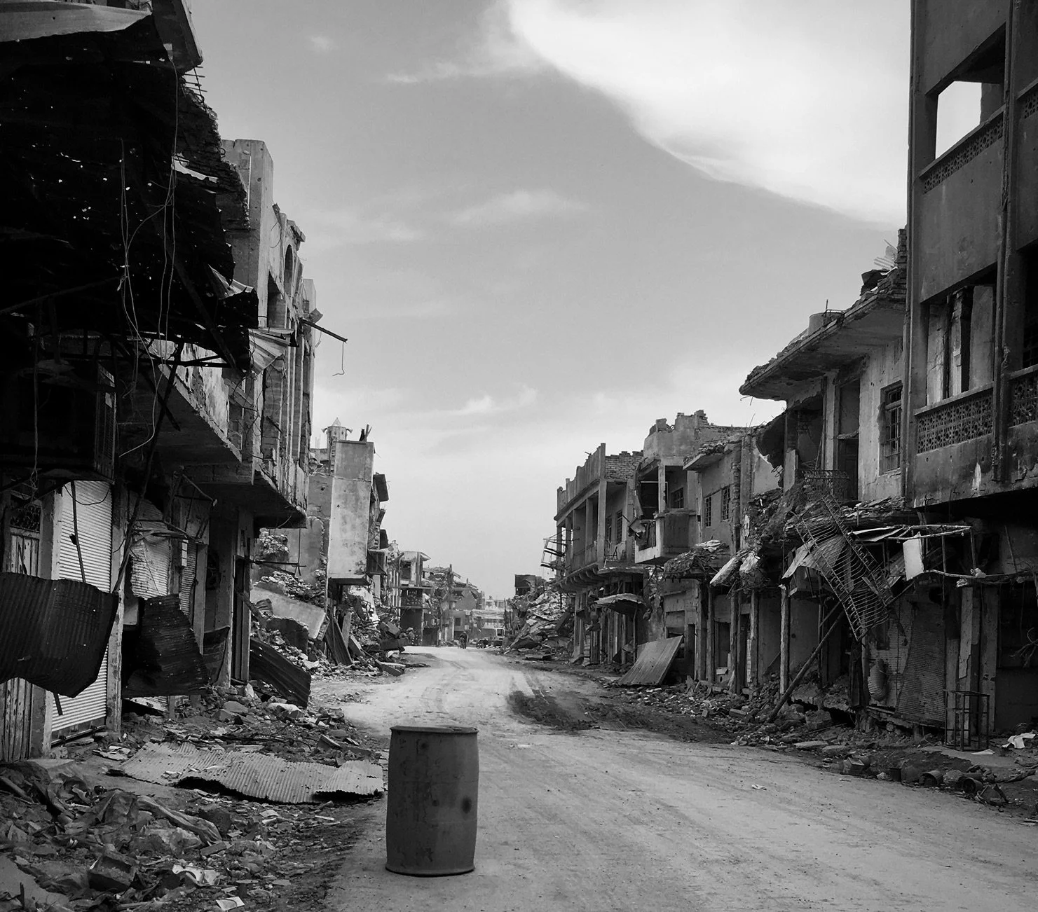 Deserted street with buildings on both sides showing signs of destruction and debris scattered on the ground, with a barrel in the middle of the street and a cloudy sky overhead.