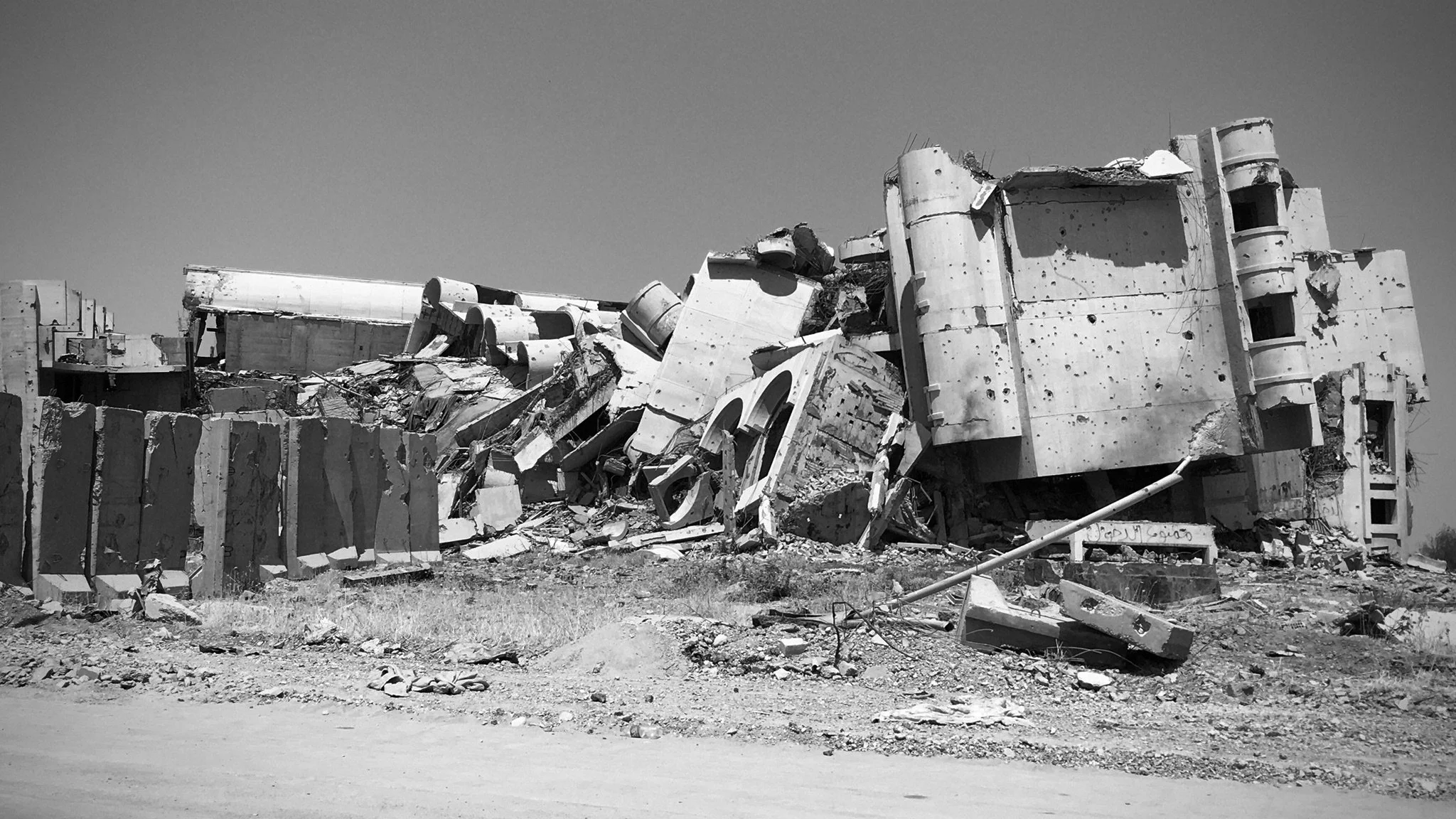 A black and white photo of a collapsed building with large concrete blocks and debris scattered around.