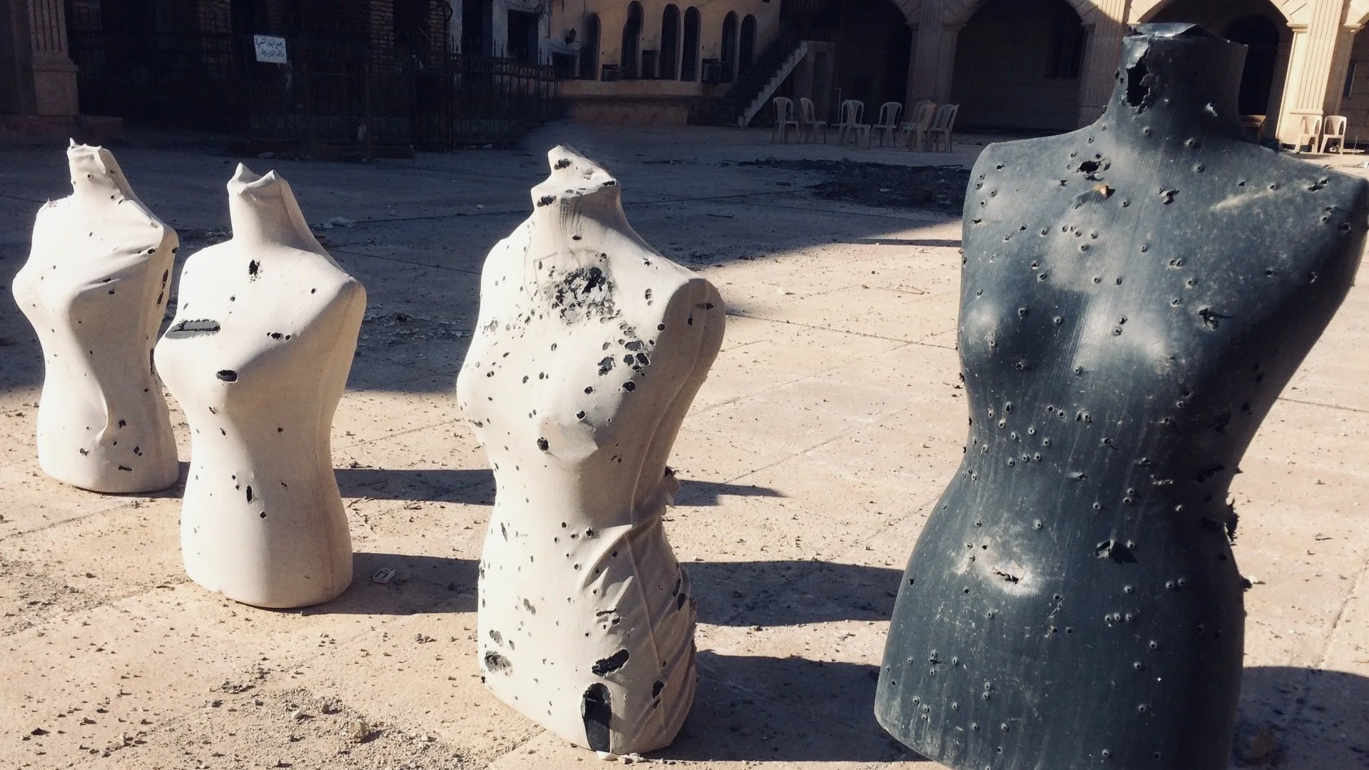 Four sculpted torsos made of stone, with the first three white and the last one black, all on a sandy surface outdoors.