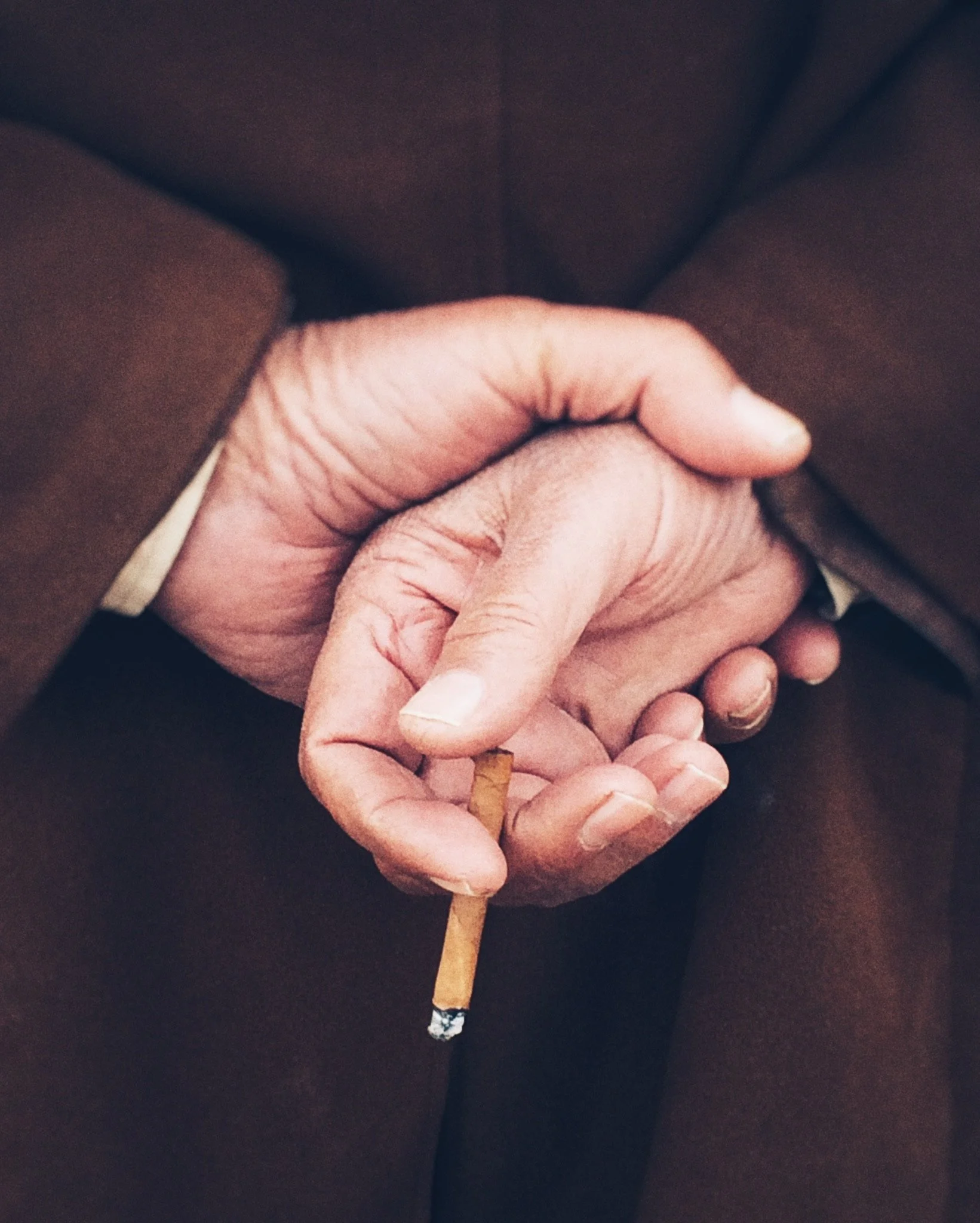 Close-up of two hands holding each other, one with a cigarette between the fingers.