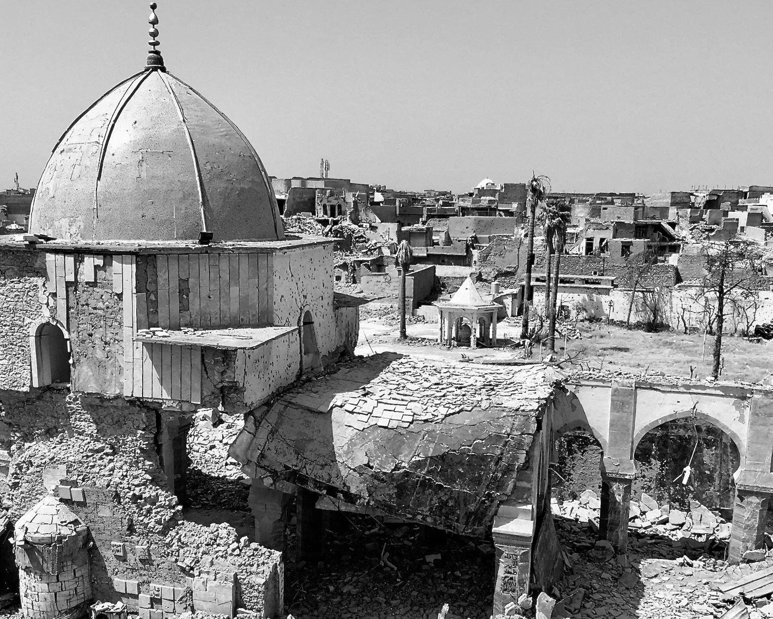 Black and white photo of a destroyed area with damaged buildings, rubble, and debris, including a partially collapsed structure with a large dome.