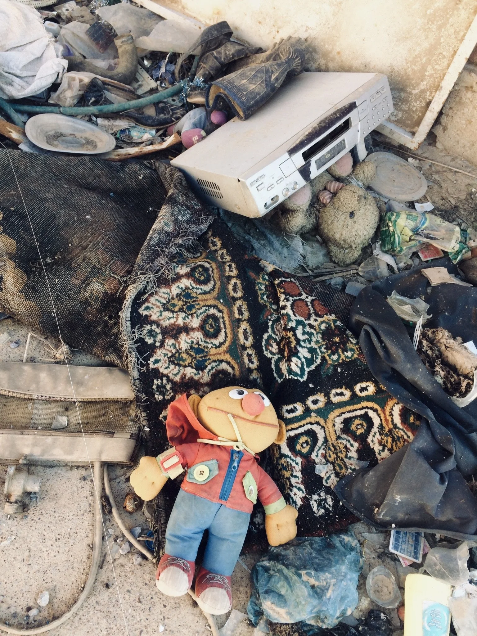 A cluttered scene with a children's puppet, a toy, a carpet, and various discarded items including a stereo, teddy bear, and trash in a messy environment.
