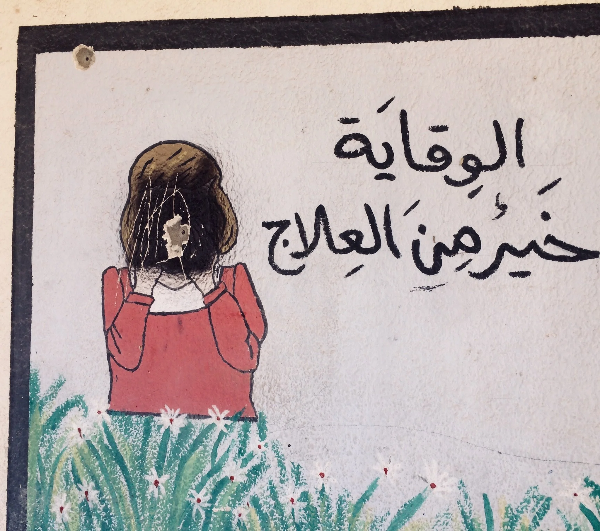 Graffiti of a woman with brown hair wearing a red shirt, covering her ears, with Arabic text that reads 'الإعاقة حريم من العلاج' in black next to her. The background is a textured wall with green plants at the bottom.